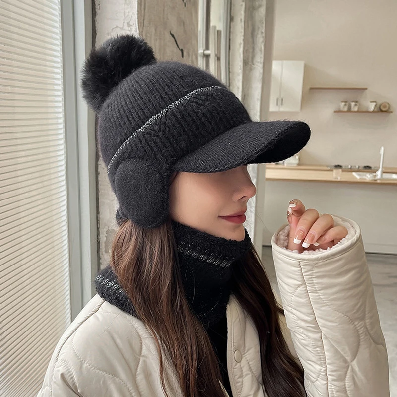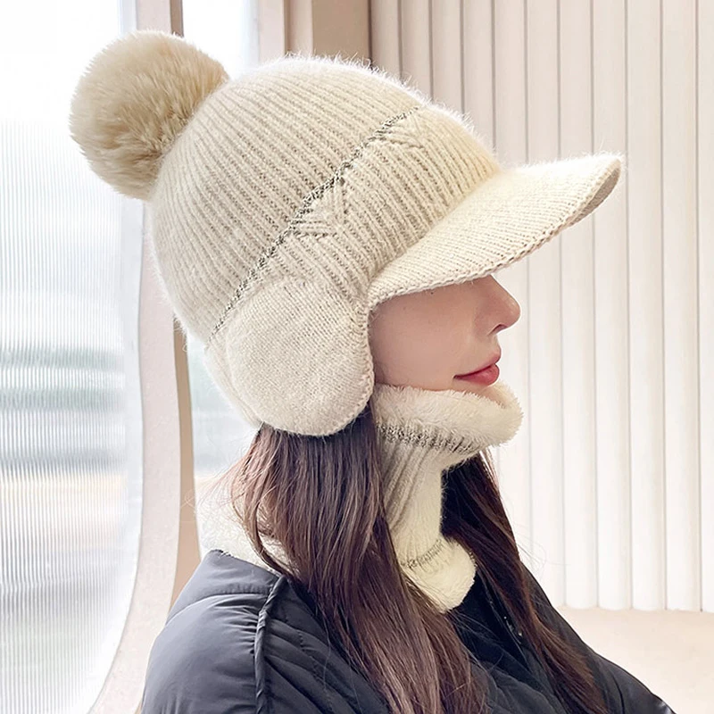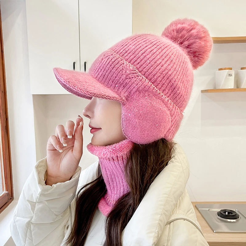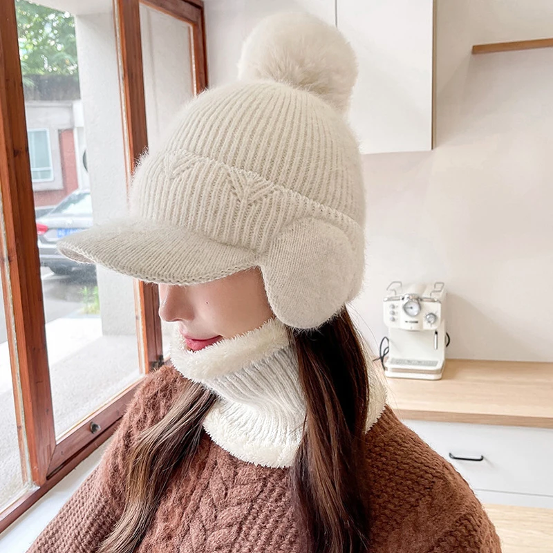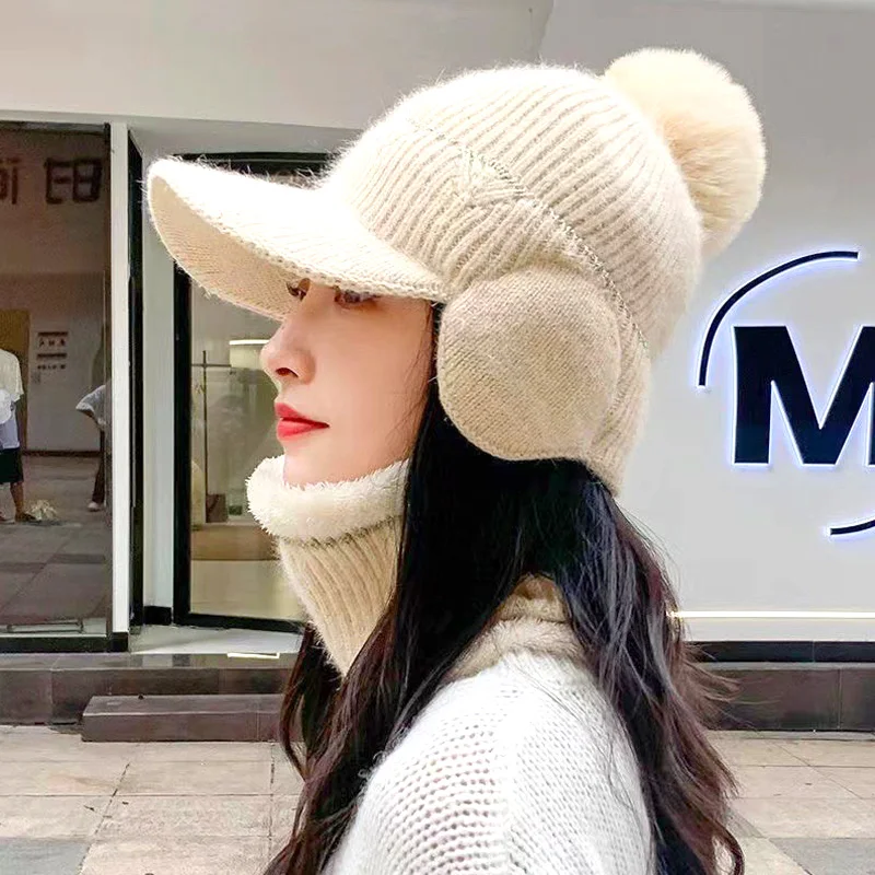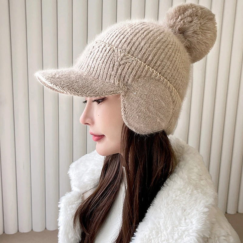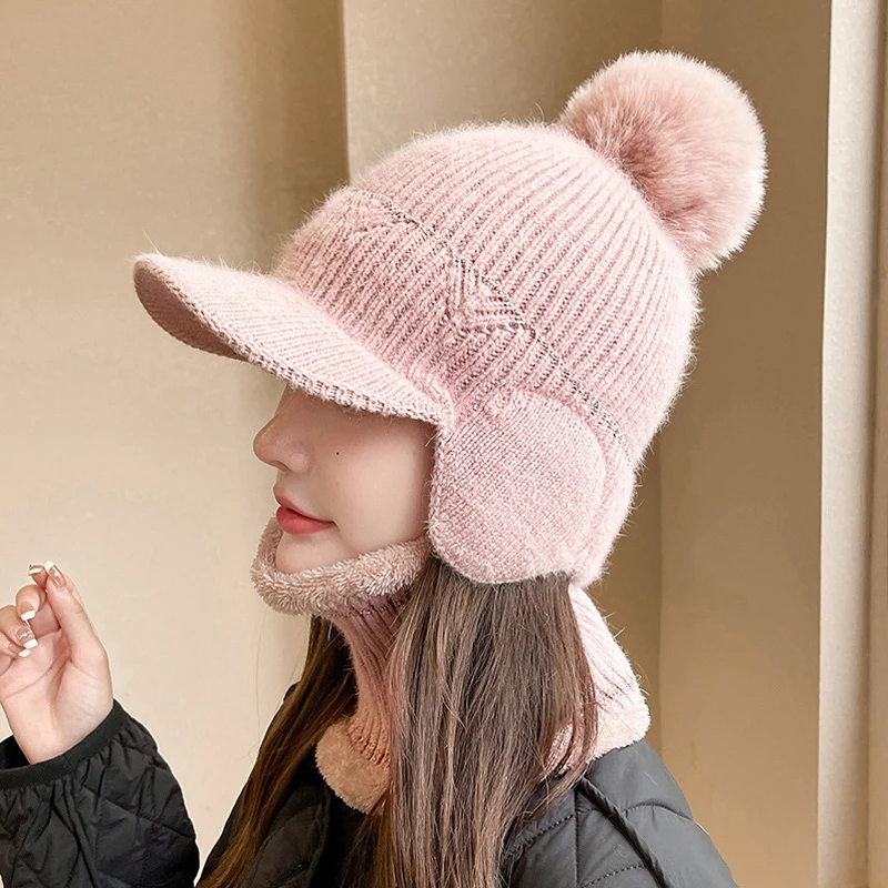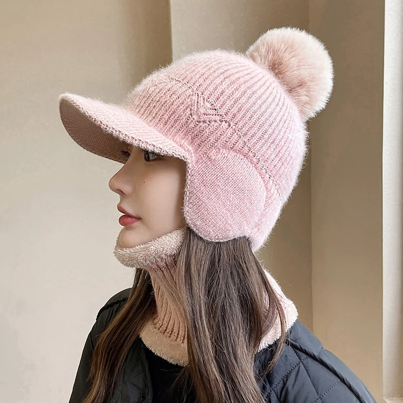Knitted Earflap Hat Winter Warm for Women'S Solid Color Pompom Ear Protection Baseball Cap Female Outdoor Cycling Earmuff Caps