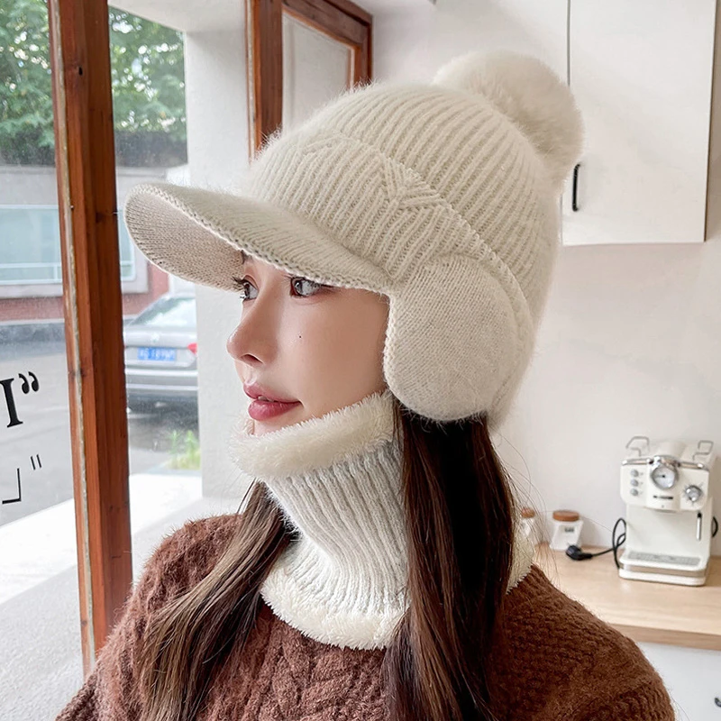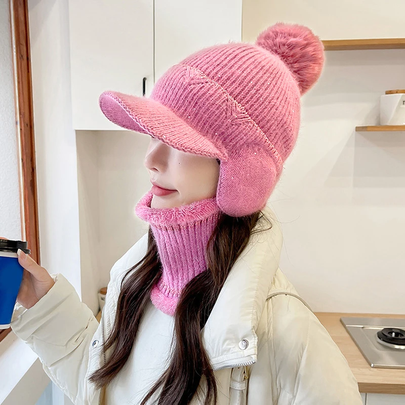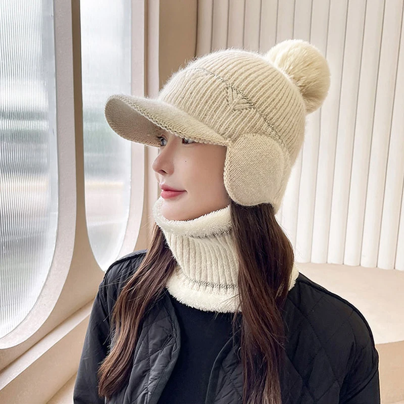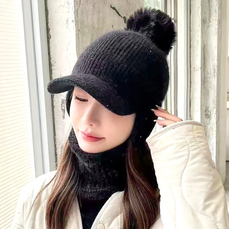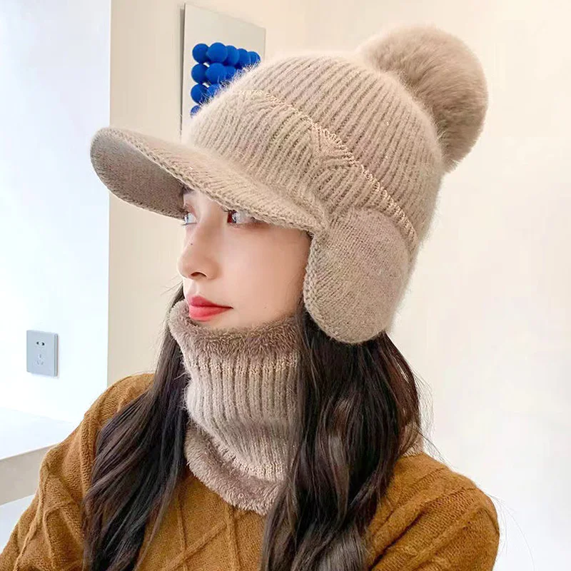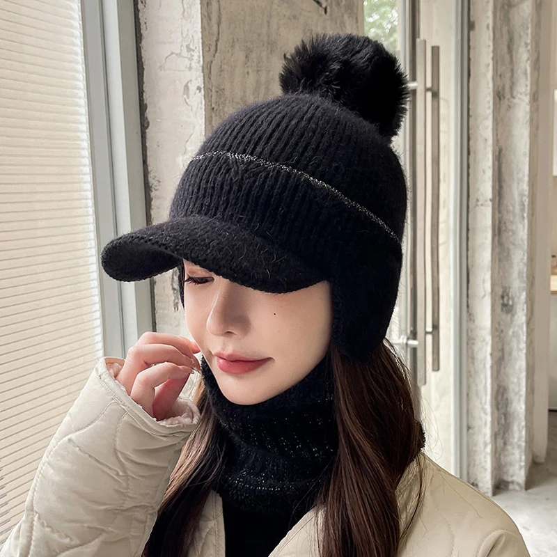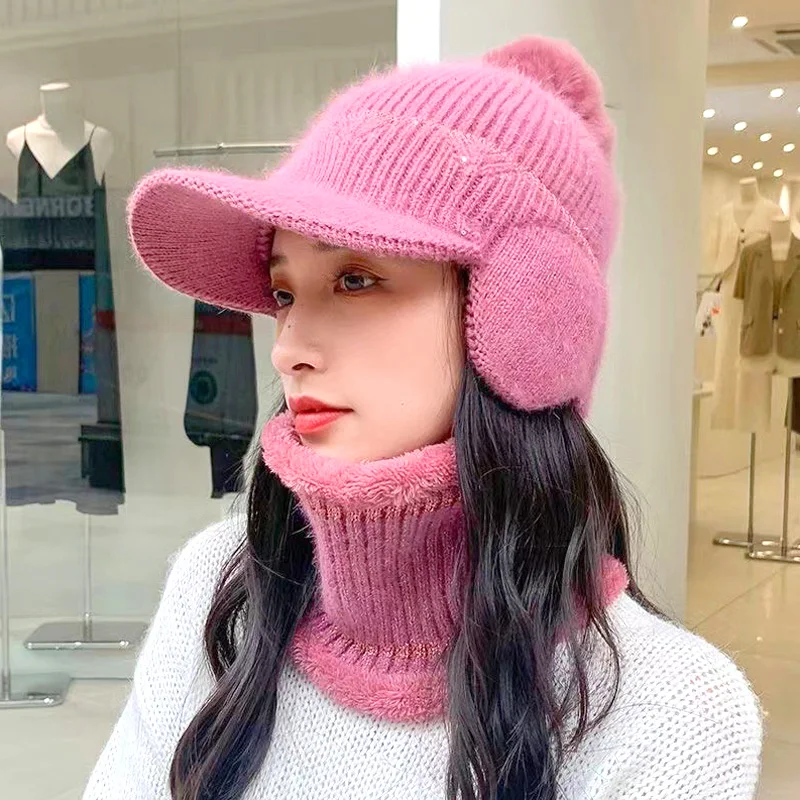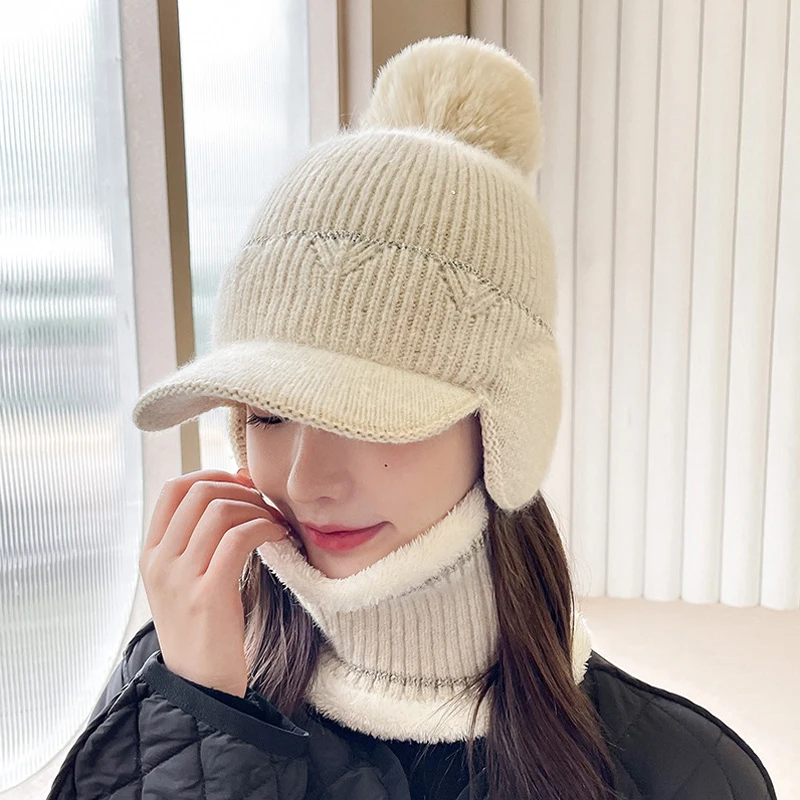 Knitted Earflap Hat Winter Warm for Women'S Solid Color Pompom Ear Protection Baseball Cap Female Outdoor Cycling Earmuff Caps